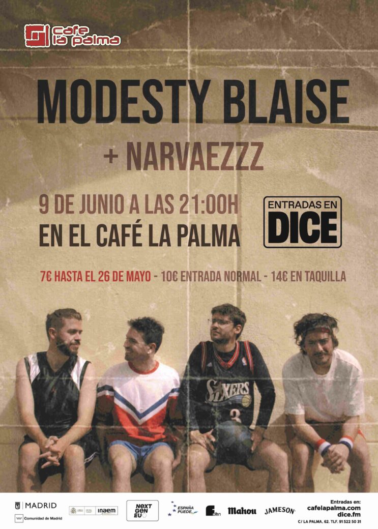 Modesty Blaise es una banda de indie pop/rock caracterizada, tal vez, por un sonido optimista y enérgico, la virtuosidad a la guitarra de Ube, la voz madura de Diego y sus letras enigmáticas e introspectivas. La banda madrileña ha anunciado la publicación de cuatro singles en 2023, de los cuales el segundo, «Puerto Blanco», será presentado en este concierto.