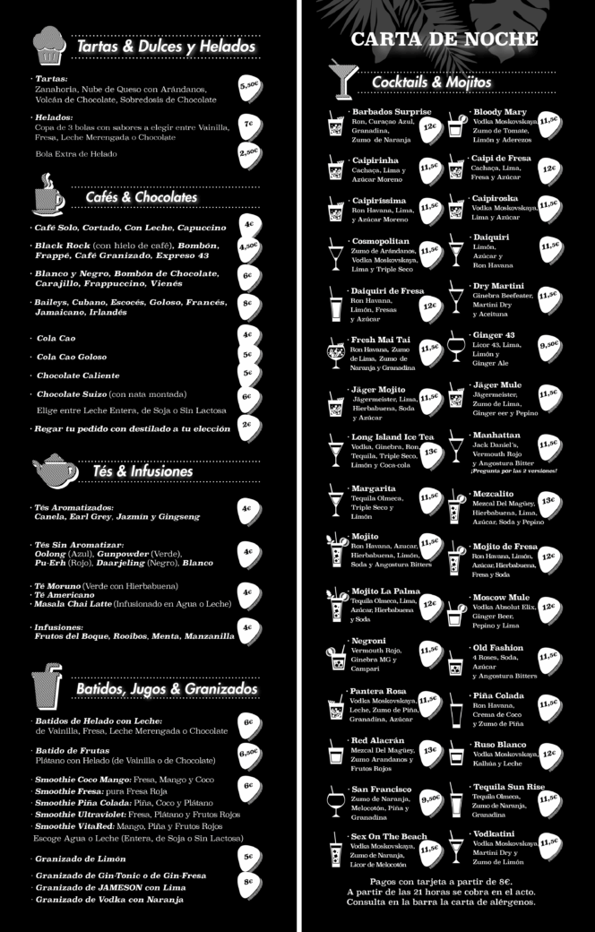 CAFE LA PALMA es un espacio vivo y en constante movimiento. Nuestro horario abarca varias franjas horarias y, por eso, hemos adaptado los precios de nuestra carta a la realidad de cada una de ellas.