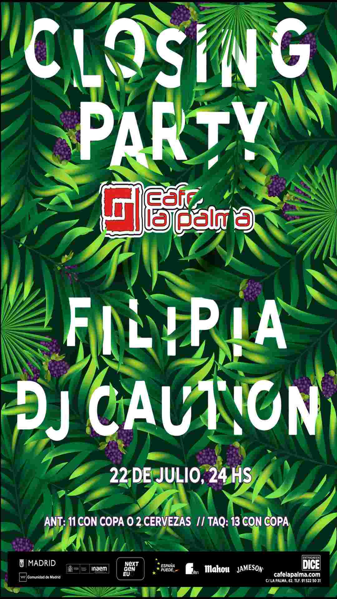 CAFE LA PALMA presenta su tradicional Closing Party con una fiesta electrónica como cierre de temporada hasta septiembre. Jesus Molina aka DJ Caution es un dj y productor español. Sus producciones abarcan un abanico de estilos procedentes de sus influencias, que van desde los sonidos negros (funk, soul, jazz, hiphop), electrónica (house, dance, disco) hasta los sonidos procedentes …