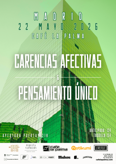 El próximo 22 de mayo, Café La Palma acogerá a los zaragozanos Pensamiento Único y a los madrileños Carencias Afectivas. La noche presentará un doble cartel que fusiona la vanguardia oscura con la urgencia guitarrera. Desde Zaragoza, Pensamiento Único trae su magnética revisión del post-punk y la dark wave británica, actualizados con un audaz uso …