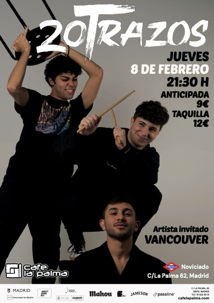 20TRAZOS es un banda de pop rock formada por Raúl Díaz (Guitarra y Voz), Tigrán Khurshudyan (bajo) y Manuel Oliva (Batería). Sus primeros temas han sido bajo la producción musical de Carlos Hernández Nombela y se componen de melodías contagiosas y letras sobre ese carácter irreverente de una juventud llena de energía y esos sentimientos cotidianos de amor, frustración y melancolía.