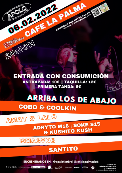 Para esta edición underground de Apolo Festival hemos preparado el mejor cartel de hip hop emergente en el radio de acción de la ciudad: COBO & COOLKIN, AMAT & LALO, ADRYTO M18 | SOKE S15 & KUSHITO KUSH, ISMAGVNG y SANTITO.