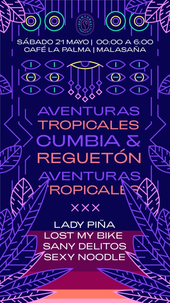 Aventuras Tropicales es sinónimo de bailongo. Fiestas y eventos celebrados en lugares originales en Madrid, a ritmo de cumbia y reguetón junto a otros ritmos latinos que van de la mano a la tendencia global que pretende unir mundos y huir de la costumbre por las sesiones lineales.