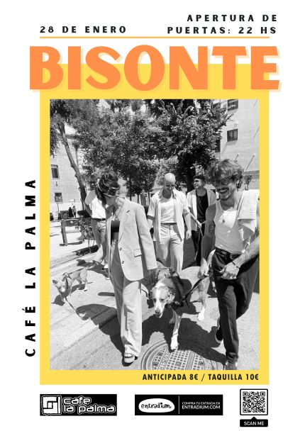 BISONTE es un grupo de origen asturiano afincado en Madrid. Con dos EPs («Bisonte», 2016 y «El Golpe», 2022) y un LP («Barrera Temporal», 2018) a sus espaldas, empiezan el año con un concierto en directo donde presentarán las canciones inéditas que conformarán lo que está siendo su segundo trabajo de larga duración dando un repaso a los temas que ya son conocidos por sus seguidores. No te pierdas el primer concierto de Bisonte 2023 que estará lleno de sorpresas.
