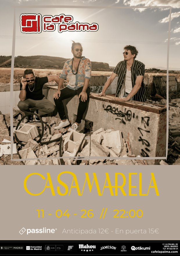 Pasado algo más de un año del primer lanzamiento y algo menos desde su primer concierto en el Café de La Palma, Casamarela vuelven a esta sala icónica de Madrid para mostrar una de sus mejores virtudes, su cuidado sonido en directo. Y hacernos bailar y cantar con un repertorio a la altura de los mejores festivales. No dejes pasar la oportunidad de disfrutar de un concierto grande en tu Sala de confianza.