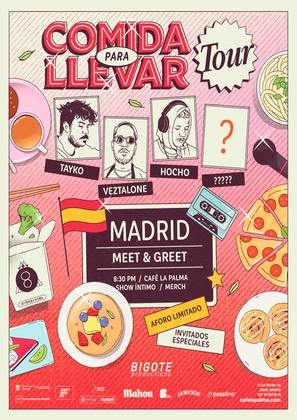 COMIDA PARA LLEVAR llega por primera vez a España, en un formato íntimo crecano al Meet & Greet de la mano de Tayko, Veztalone y Hocho en el mítico CAFE LA PALMA. Una noche llena de sorpresas, invitados especiales y merchandising exclusivo. Aforo limitado.