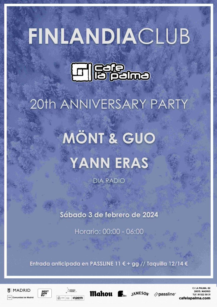 El colectivo independiente barcelonés FINLANDIA CLUB, agitador incansable de la noche electrónica catalana desde 2004, celebra este año su 20 Aniversario. Una ocasión de excepción para festejar como merece la inmaculada trayectoria de FINLANDIA CLUB en su incesante promoción del clubbing más elegante y atrevido, y también su faceta de Djs como orfebres de los más excelsos sonidos de baile siempre dirigidos al hedonismo y disfrute pero sin caer en evidencias ni reducciones. Dos décadas de amor por la música que verán su reflejo a través de dos de sus miembros fundadores, MÖNT y GUO.