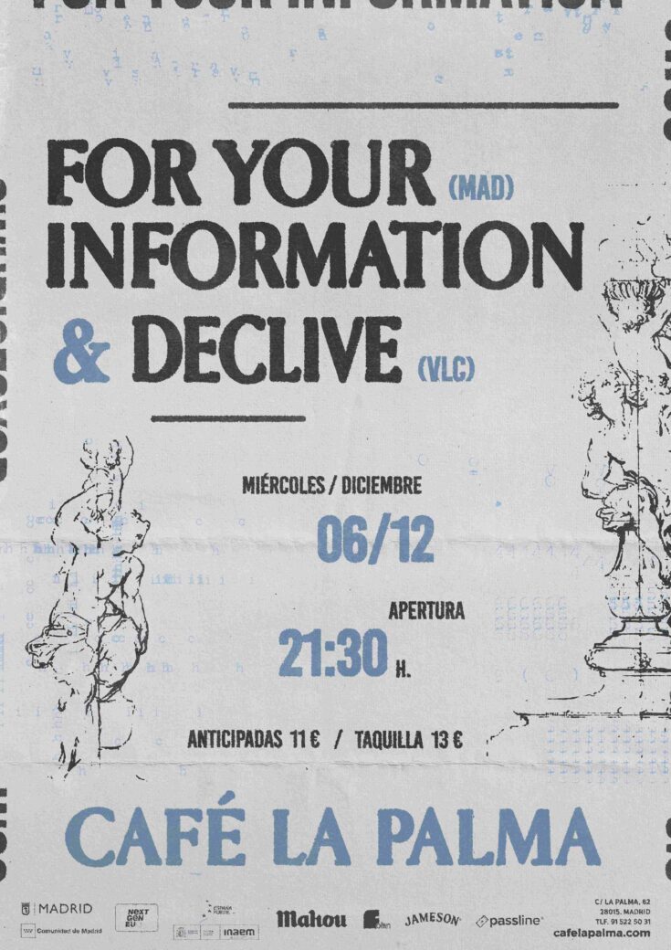 FOR YOUR INFORMATION –FYI– es una banda formada en Madrid por cuatro amigos de Albacete. Música que nace del hastío de la vida en la gran ciudad. La rutina, el cansancio y las ganas de dejarlo todo cristalizan en canciones para mostrar que el post-punk y su tentáculo más pop pueden moverte de la silla de tu oficina. Grabado y producido por Paco Loco, publican su primer EP “El año del descenso” y el reciente single “Confianza Brutal”.