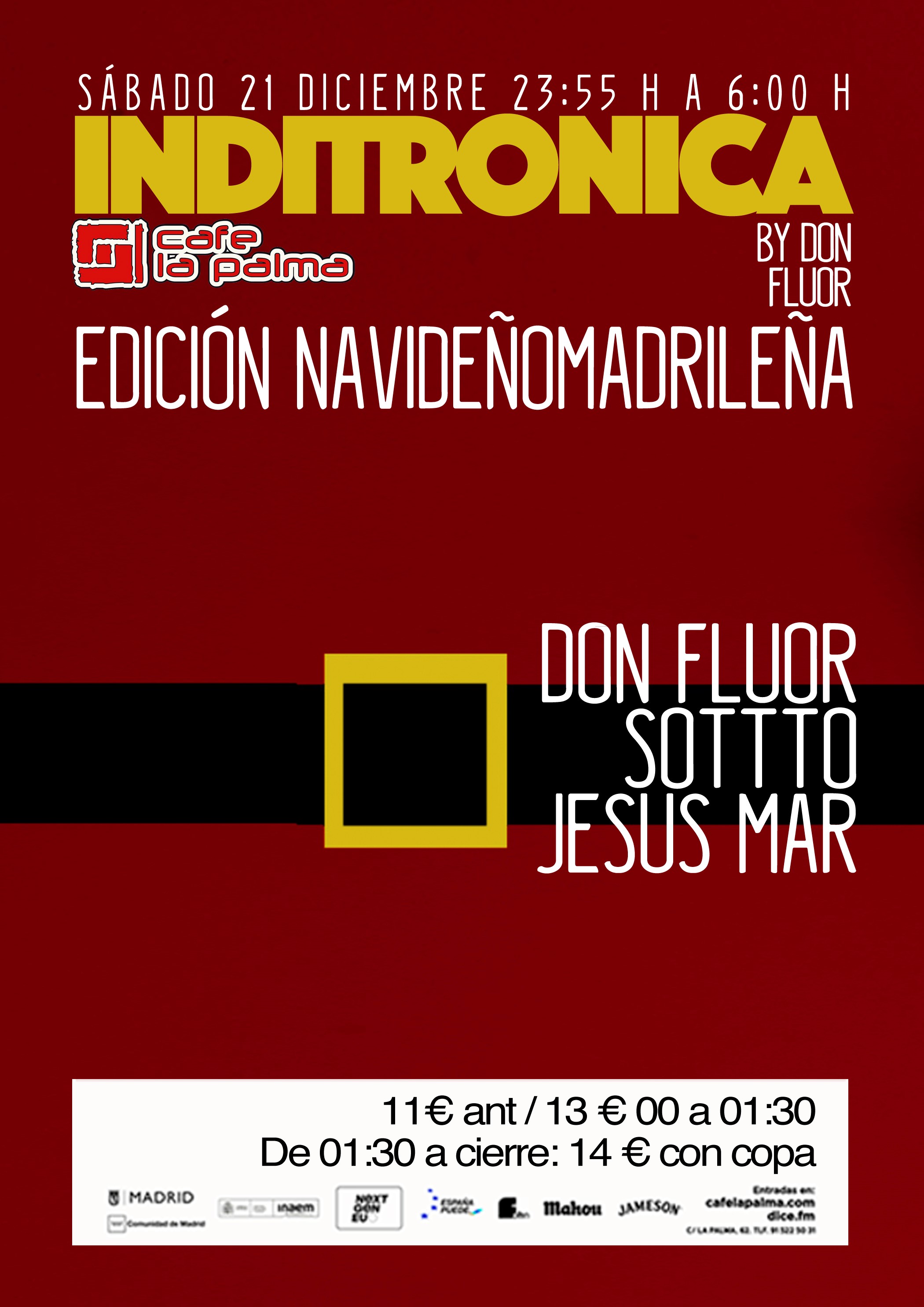 11€ + gg Anticipada | 13€ Taquilla de 00:00 a 01:30 | 14€ Taquilla de 01:30 a cierre. Todos los tramos de entrada incluyen UNA CONSUMICIÓN. Canjeable por DOS CERVEZAS DE BARRIL antes de las 01:30
