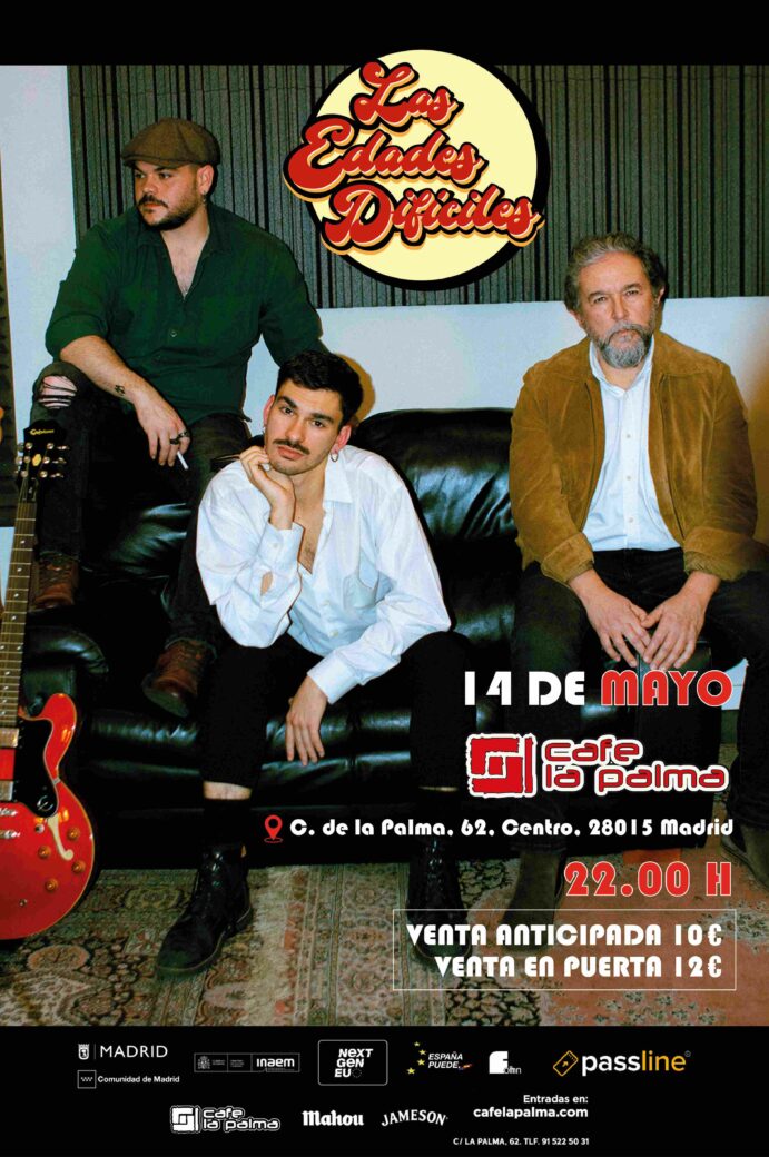 En esa búsqueda se encuentran LAS EDADES DIFÍCILES, que presentarán sus nuevas canciones en CAFE LA PALMA nada más acabar de grabar el que será su primer disco. Pop rock fronterizo que recoge la oscuridad de los tugurios en los que habrían compartido bebida Nacho Vegas y Tom Waits y la vitalidad de la rumba de Nueva Orleans, traída por Muchachito Bombo Infierno.
