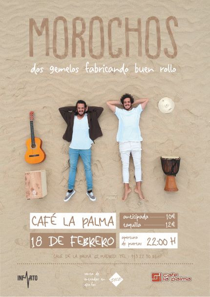 Morochos son dos gemelos fabricantes de buen rollo, fruto de la fusión del flamenco y el reggae como ingredientes principales, un puñao de alegría, una dosis de vida furgonetera, una guitarra y un cajón. Su objetivo es muy claro: contagiar alegría y buen rollo allá donde vayan.