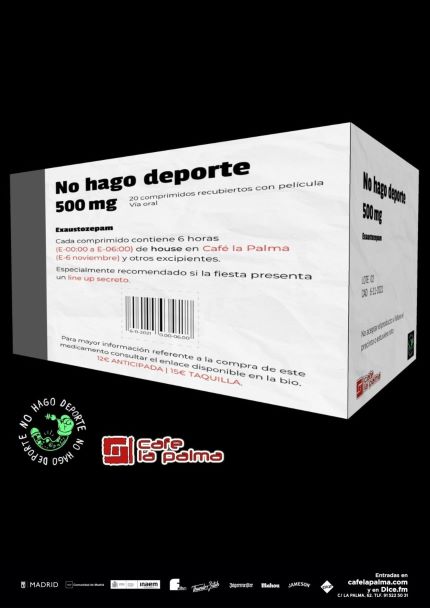 No hago deporte no es una fiesta como tal, sino un lugar y un momento de encuentro entre amigxs del mundo de las artes, donde se celebra la libertad y el desenfado al más puro estilo MADRID.