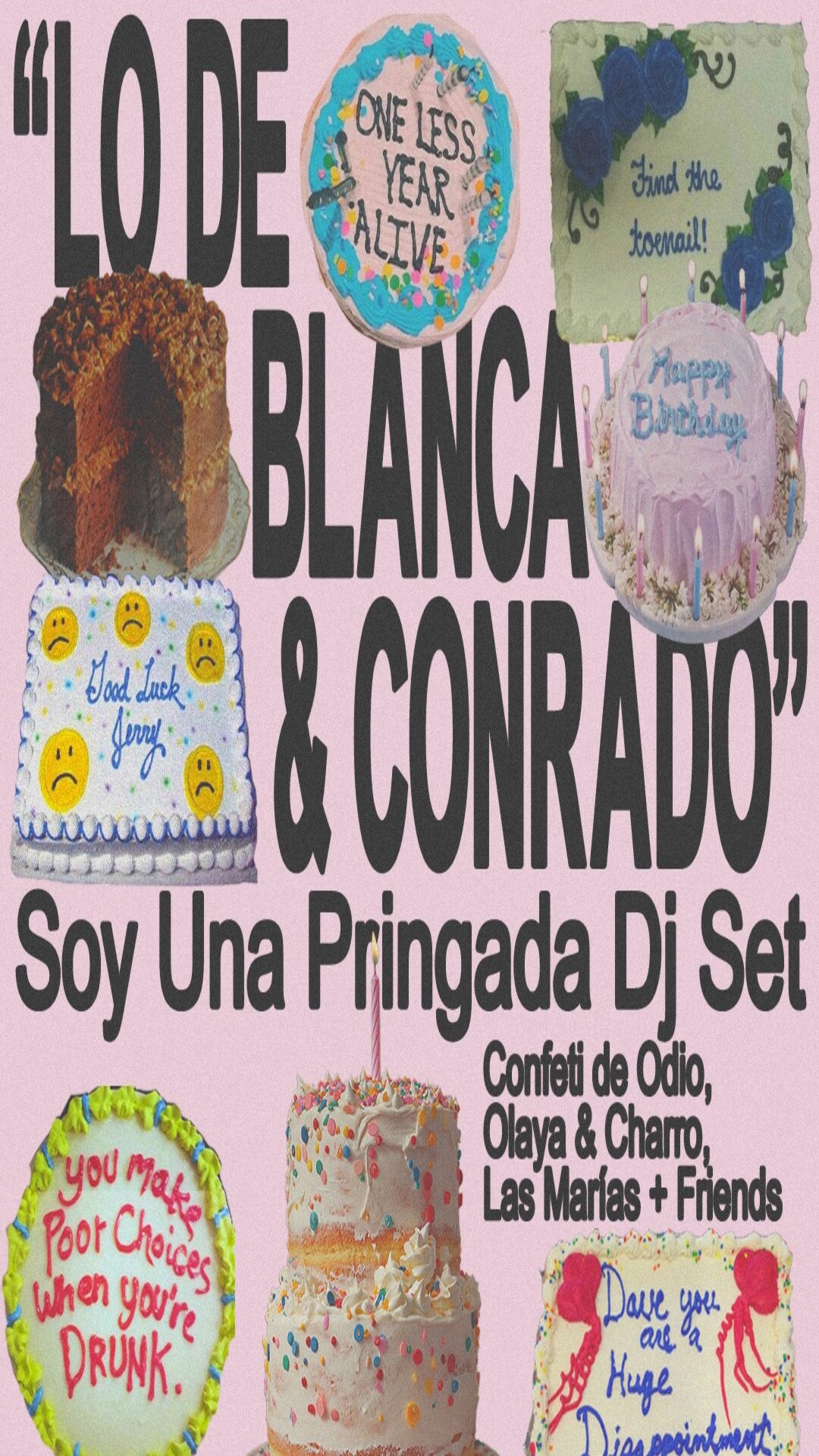 El sábado 11 de enero toca celebrar el cumpleaños de Blanca y Conrado, que han organizado una noche altamente divertida para el disfrute de todas sus amigas. Los mandos de la fiesta los tomarán SOY UNA PRINGADA, CONFETI DE ODIO, OLAYA AXOLOTE & CHARRO y LAS MARÍAS. Blanca (Joder Juan) y Conrado (Doctor Explosión) estarían …