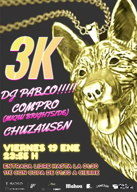 3K es una fiesta hosteada por MIQUI BRIGHTSIDE –en sus vertiente latina con su aka COMPRO – y CAFE LA PALMA. Tras múltiples ocasiones compartiendo juntos escenario, los tres artistas suman sus fuerzas –y sus estilos– para recrear una noche inédita donde el reggaeton y los latin beats serán los protagonistas.