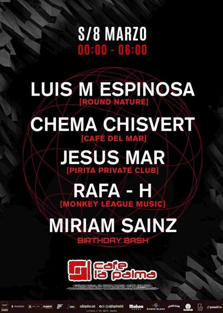 BIRTHDAY BASH se presenta en CAFE LA PALMA para plantear una electrónica de calidad con los siguientes Djs LUIS M ESPINOSA [Round Nature], CHEMA CHISVERT, RAFA – H [Monkey League Music], JESÚS MAR [Pirata Private Club] y MIRIAM SAINZ.