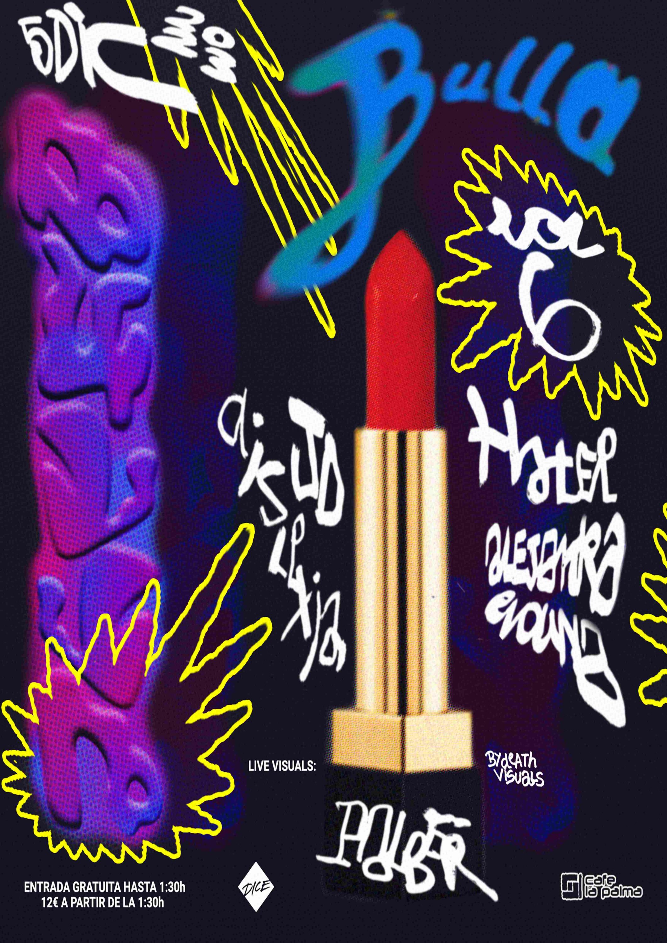 Después de varios meses de espera, la sexta edición de la fiesta vuelve de la forma más especial posible. Una de las características de Bulla es la apuesta por propuestas diferentes de djs emergentes, dentro de un marco propio, con el objetivo de aportar un aroma distinto a cada noche. En esta ocasión, el line up estará formado por Hater, JD Dislexia, Alejandra Evouna y Palber, fundador de Bulla.