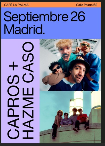 CAPROS entró en el 2025 siendo una de las bandas seleccionadas por MondoSonoro para sus Demoscópicas y resultando finalistas de la Guerra de Bandas del Actual Festival 2025. En junio vio la luz «FOMO», primer single de su esperado nuevo disco, que verá la luz tras un verano en el que siguen dándonos sorpresas como su recién publicada cover de «DtMF» de Bad Bunny.