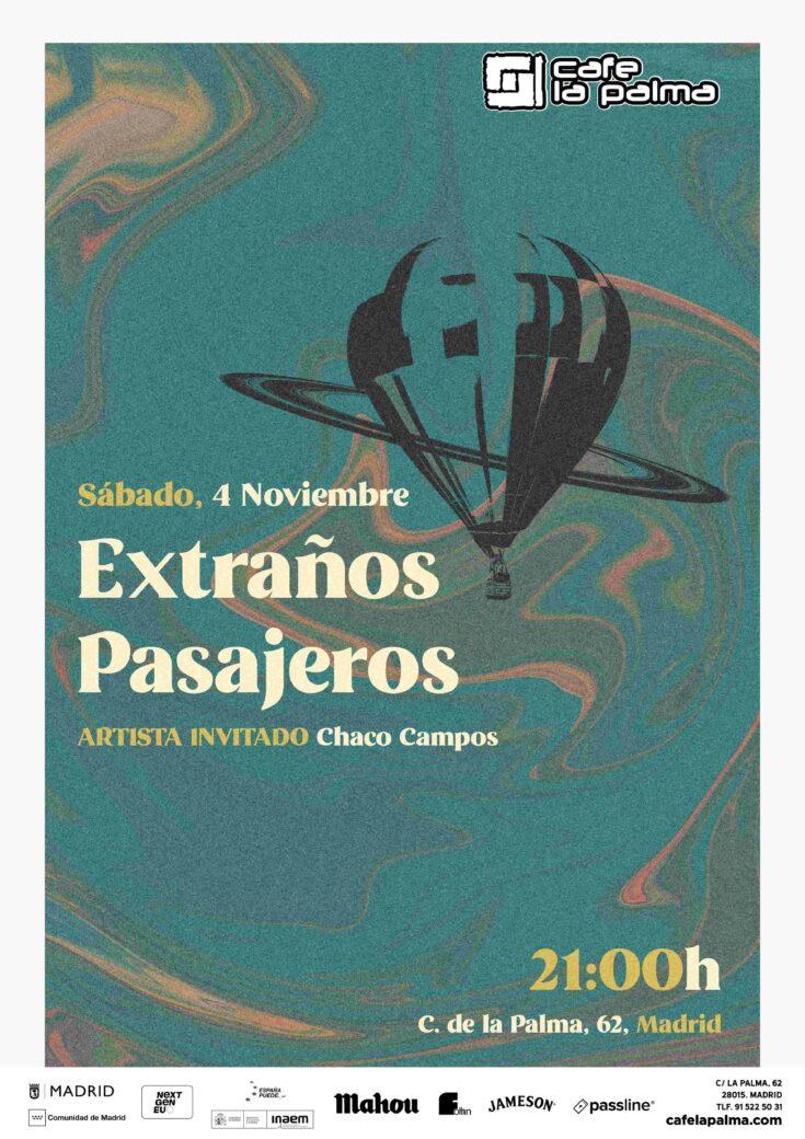 Letras nostálgicas y ritmos enérgicos como contraste engloban lo que será el primer disco de Extraños Pasajeros, una mezcla de sonidos clásicos de guitarras estridentes con el mundo de los sintes. Una guerra entre lo moderno y lo vintage. La presentación, en el emblemático CAFE LA PALMA de Madrid.