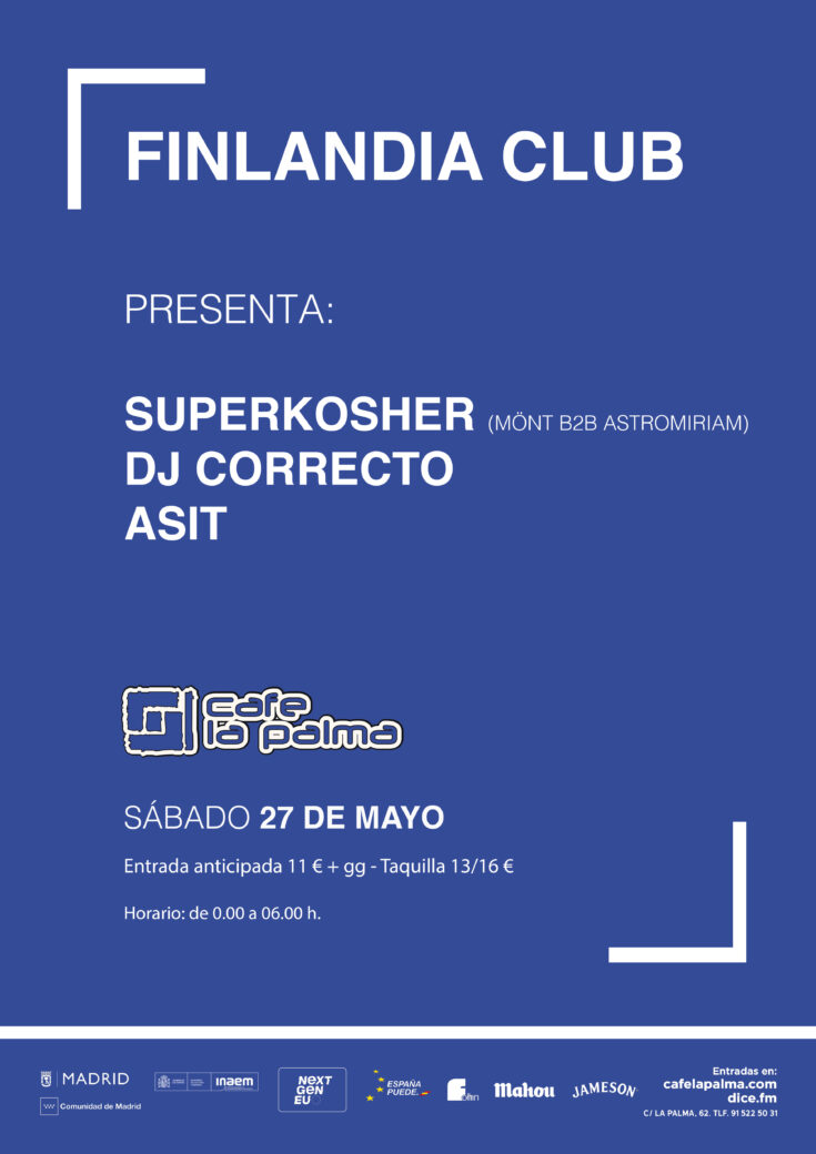 En esta ocasión la sesión será dirigida por cuatro djs de la agrupación catalana, que en el auge de la primavera madrileña revisarán algunos de los episodios más relevantes de la historia reciente de la música de baile. Mönt b2b Astromiriam en su unión de fuerzas como SUPERKOSHER, el pamplonés afincado en la Ciudad Condal, Dj Correcto, y Asit, deambularan sin ataduras por sonidos coloridos e impetuosos pero también por rutas menos evidentes y subterráneas pero igualmente estimulantes.