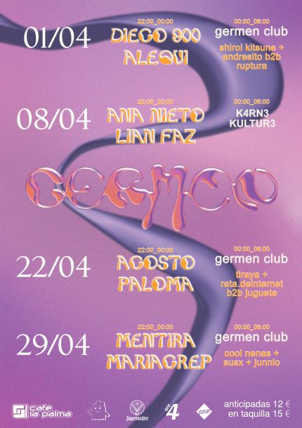 Tras los conciertos de AGOSTO y PALOMA programados para la tercera sesión del ciclo GERMEN, abriremos el clubbing con TIRAYA, dj que combina disco, funk, latin house, tech y old school. Por último, cerraremos la noche con RATA.DEINTERNET y JUGUETE, dos djs reconocidxs por haber pasado por Industrial Copera y Boiler Room, respectivamente. Ambos se unirán en un b2b único para traernos diversión, locura y energía pasando desde la electrónica más pura al pop más desenfadado.