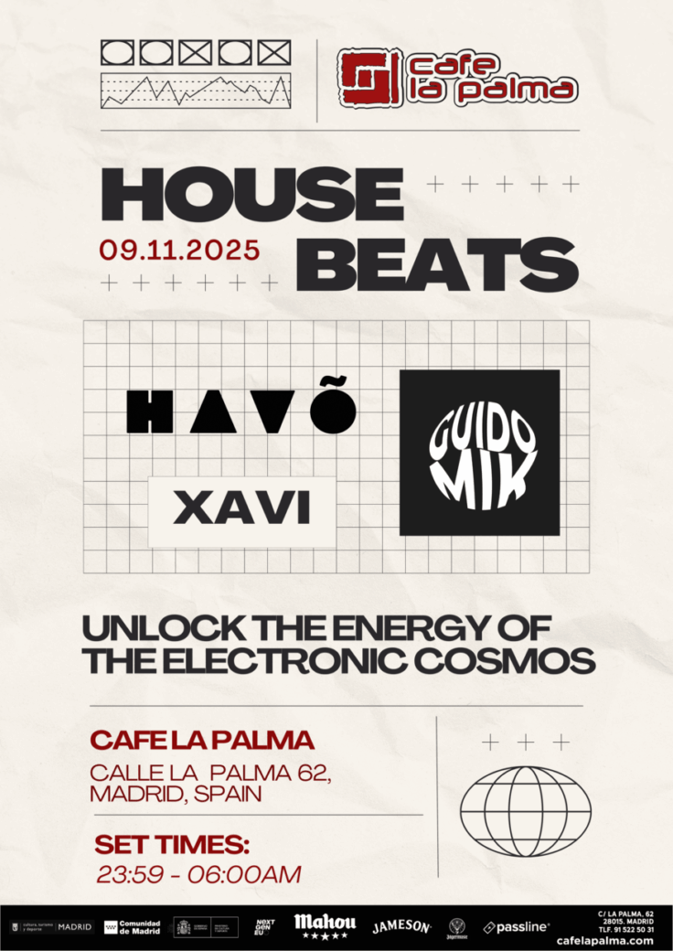 El próximo domingo 9 de noviembre, con el lunes festivo por delante , Café La Palma se convierte en el punto de encuentro para los amantes del house. Una noche para disfrutar entre amigos, dejarse llevar por el ritmo y celebrar el espíritu del club sin relojes ni presiones. Tres DJs internacionales se unirán para ofrecer una sesión cargada de groove, energía y buena vibra. Música para moverse, conectar y cerrar el fin de semana como se merece.