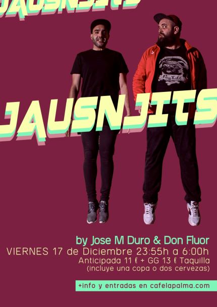 JAUSNJITS es la nueva propuesta de José M. Duro y Rafa López aka Don Fluor en CAFE LA PALMA: grooves jauseros mezclados oportunamente con hits discotequeros de todos los tiempos. Una sesión de seis horas en la que dos artistas muy distintos ponen desde la cabina su visión apasionada de la música de baile.