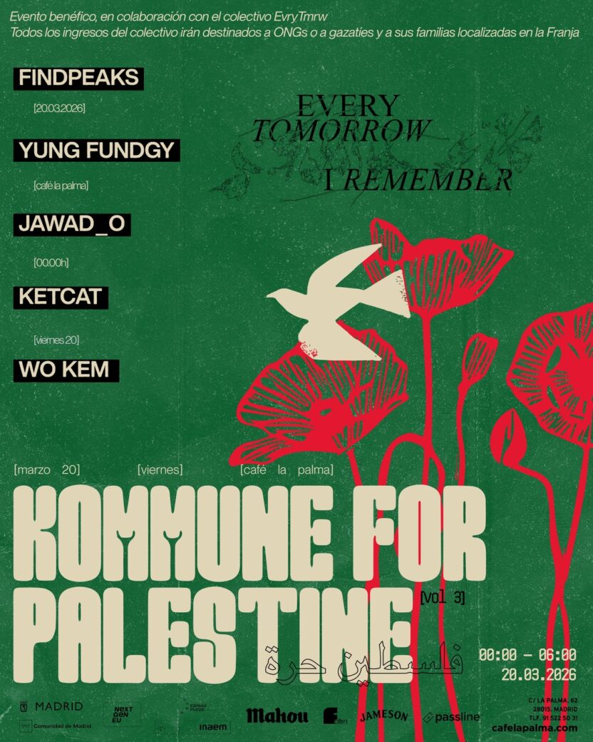 Nos sentimos optimistas e inspiradxs por la creciente concienciación y posicionamiento de diferentes naciones, así como y el compromiso y múltiples boicots de figuras de la escena electrónica, que demuestra que bailar en una pista es un acto político. Por ello, el 20 de marzo volveremos a bailar al unísono para la causa, en una noche donde los 5 djs y el equipo de Kommune, trabajarán de forma no remunerada para poder recaudar lo máximo posible para ayudar a la población de Gaza. Las donaciones se destinarán a ONGs nacionales e internacionales, y como en las demás ediciones, os iremos informando de todo el proceso.