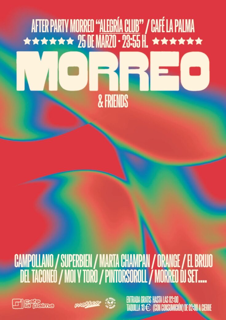 El 25 de marzo MORREO presenta su nuevo disco, “Alegría”, en un formato especial clubbing. Esa misma noche tendremos el afterparty en CAFE LA PALMA, organizado por Las Amigas.