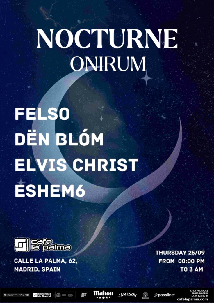 NOCTURNE es un viaje sensorial hacia la medianoche, un espacio donde la música y la atmósfera se funden en un estado onírico. Inspirada en la quietud y el misterio de la noche, esta experiencia busca conectar almas en un trance colectivo, uniendo arte, ritmo y sensaciones en un escenario íntimo y envolvente. Acompaña la pista de baile con curadores expertos en Indie Dance/ Dark Disco…