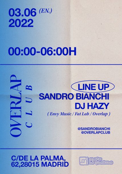 Dj Hazy hostea Overlap Club, un proyecto que nace con la idea de recuperar la esencia original de los clubs, donde lo único que importaba era la música, la energía y la experimentación. Amistad, cierres emocionantes y cierto punto de ingenuidad. Overlap Club está aquí para alimentar la escena underground madrileña. Subcultura y experimentación sin prejuicios para cautivar y conectar a toda una generación de clubbers ávidos de vanguardia e innovación.