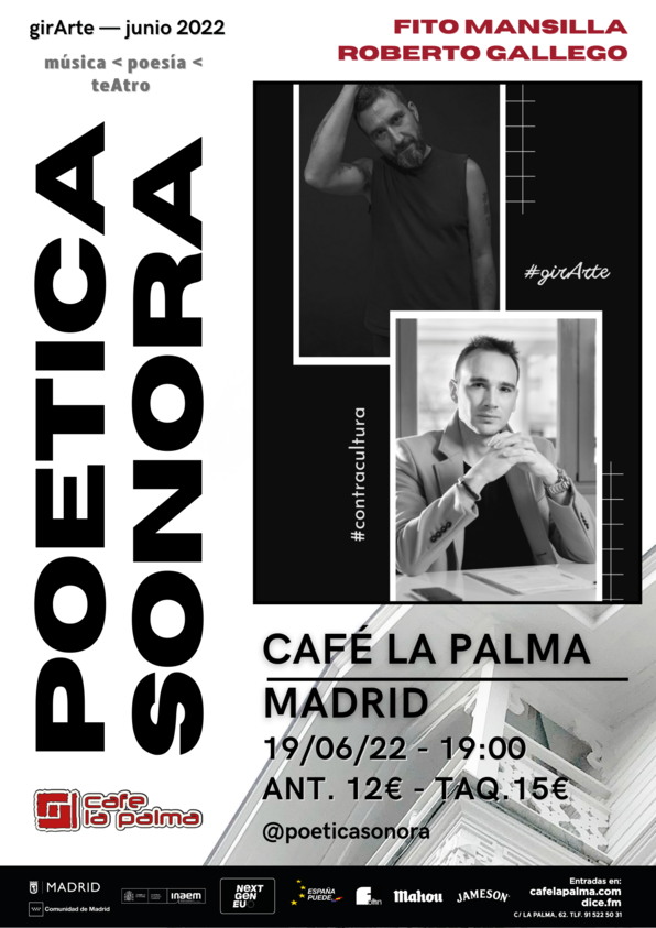 POÉTICA SONORA es la puesta en escena de primer nivel de la mano del escritor y actor Roberto Gallego y del músico Fito Mansilla, donde se conjuga en sincronía perfecta la interpretación, la crítica, las proyecciones, la poesía y la canción de autor. Un espectáculo que brilla al margen de la cotidianidad del circuito. Mordaz. Íntimo. Diferente. Poética Sonora: Contracultura.