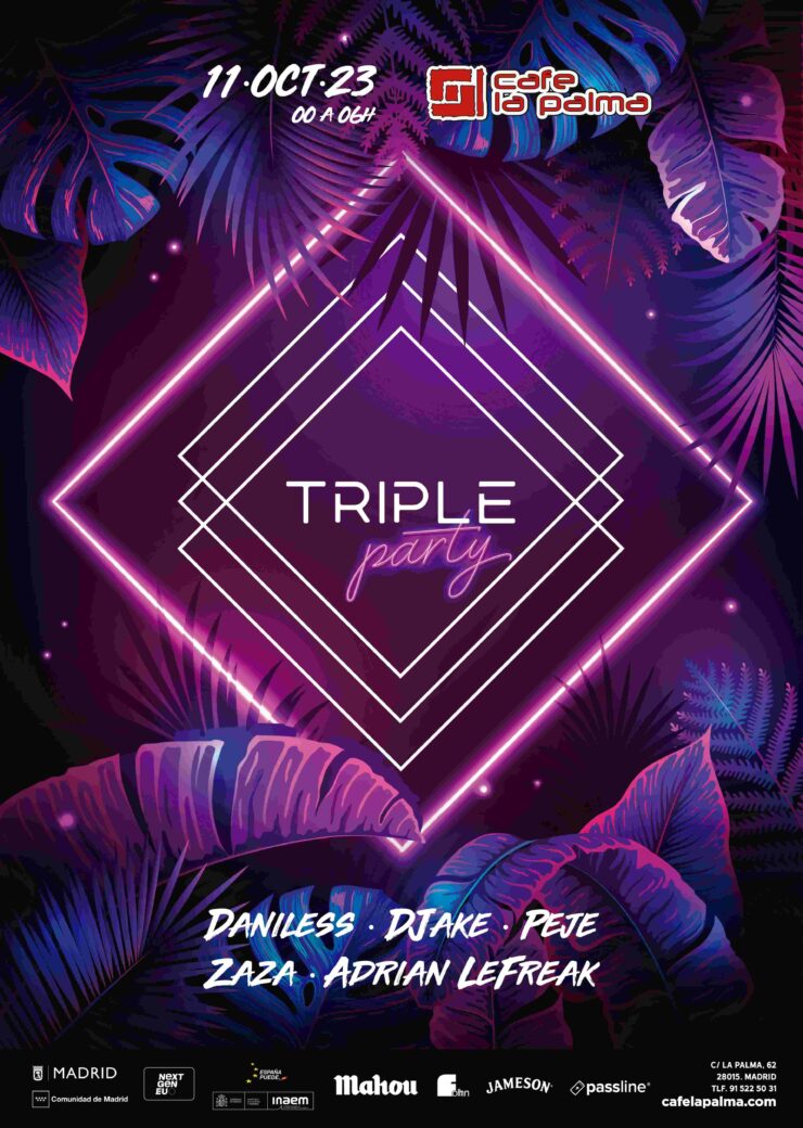El 11 de octubre llega el tsunami TRIPLE a CAFE LA PALMA. Toda la energía de este colectivo, que navega con irreverencia en la ausencia de estilos que lo encorseten, se concentrará para poner patas arriba la pista. Rara vez todos los miembros del colectivo coinciden para compartir mesa y fusionarse en un mismo sonido que solo tiene un fin: poner a todo el mundo a bailar.