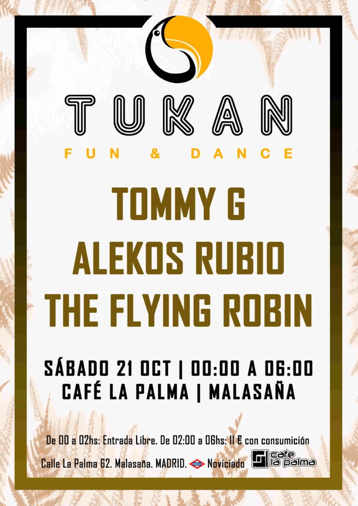 TUKAN son risas, familiaridad, frescura, alegría, novedades y recuerdos, son colores y sabores, dulce con un punto de picante. En esta sesión contaremos con THE FLYING ROBIN, un Dj que vive por y para el House, que actualmente es también residente de las fiesta Mostaza Madrid y que, a lo largo de su trayectoria, ha recorrido las mejores cabinasde la capital, además de estrenarse como productor y remixer.