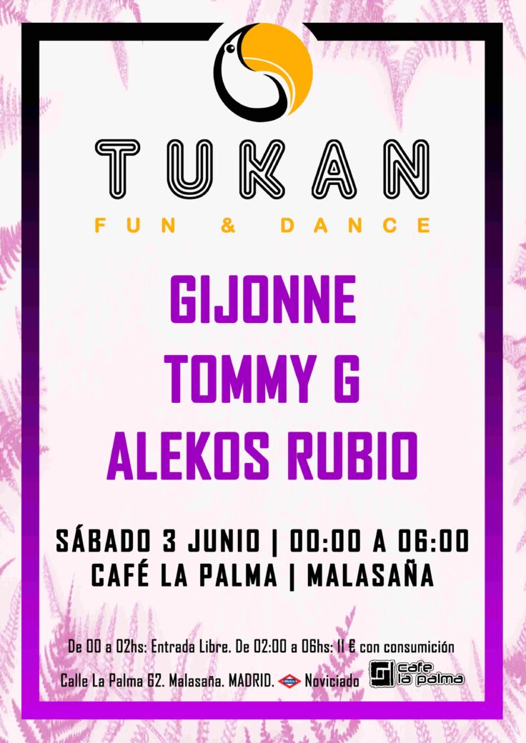 TUKAN son risas, familiaridad, frescura, alegría, novedades y recuerdos, son colores y sabores, dulce con un punto de picante. Para esta nueva edición de TUKAN: fun & dance, contamos como invitado con un habitual de la escena house madrileña: Gijonne, promotor de la conocida sesión Mostaza, además de residente de Panda Club.
