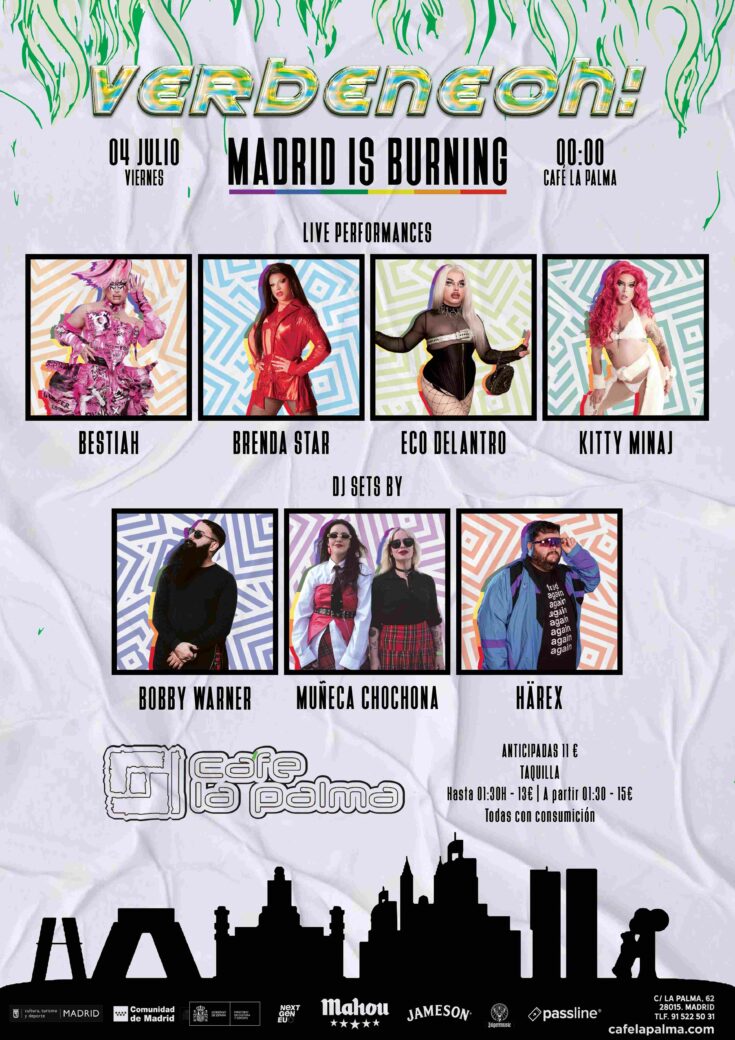 En su desembarco en Madrid, VERBENEOH! contará con un elenco de artistas que garantizan una experiencia inolvidable. BOBBY WARNER, MUÑECA CHOCHONA y HÄREX se encargarán de que la cabina se mueva al ritmo de house music, Jersey Club y hits pop aderezados con Vogue.