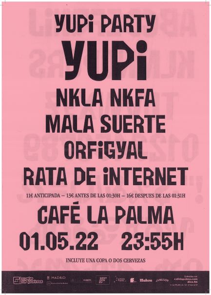 ¿Alguna vez has ido a una fiesta donde relacionarte a través de tu signo del zodiaco y tu malestar contemporáneo? Nosotras tampoco, pero te la traemos a CAFE LA PALMA. Bienvenid@ a un espacio para exponer y expresar nuestros malestares y estrategias para lidiar con ellos. Para ello te daremos una tarjeta donde identificar estas características. Esta es una fiesta para yupis, que clausura la exposición yupi en la Sala de Arte Joven. Recomendamos dresscode yupi, de libre interpretación.